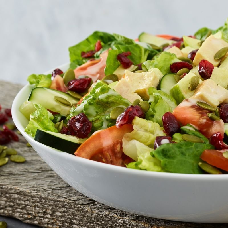 Honey-dijon chicken salad, apples, dried cranberries, cucumbers, tomatoes, pumpkin seeds, apple cider vinaigrette.